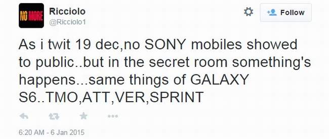 Безусловно, с закрытых презентаций информации много не достать. Однако то, что они состоялись, это точно. В Твиттере появилась информация от некого Ricciolo, который постоянно предоставляет неофициальные данные о смартфонах Сони. Источник подтвердил слухи о Xperia Z4 и Galaxy S6. Кстати, похожая ситуация была и на CES 2014, когда южнокорейский производитель готовился к премьере Галакси С5.